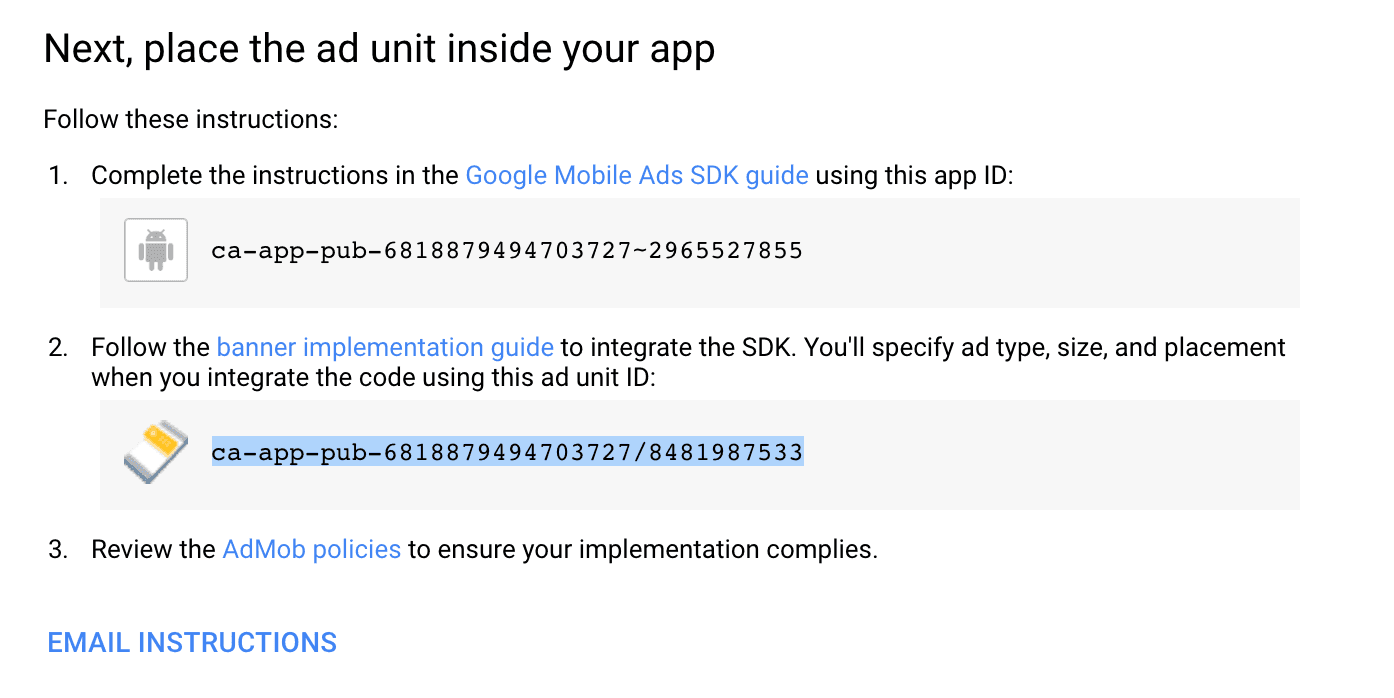 The first identifier is the app id. The second is the ad unit identifier. You need to know these identifiers to insert them in the game properties and actions parameters to display the ads. Copy them or leave the screen open.