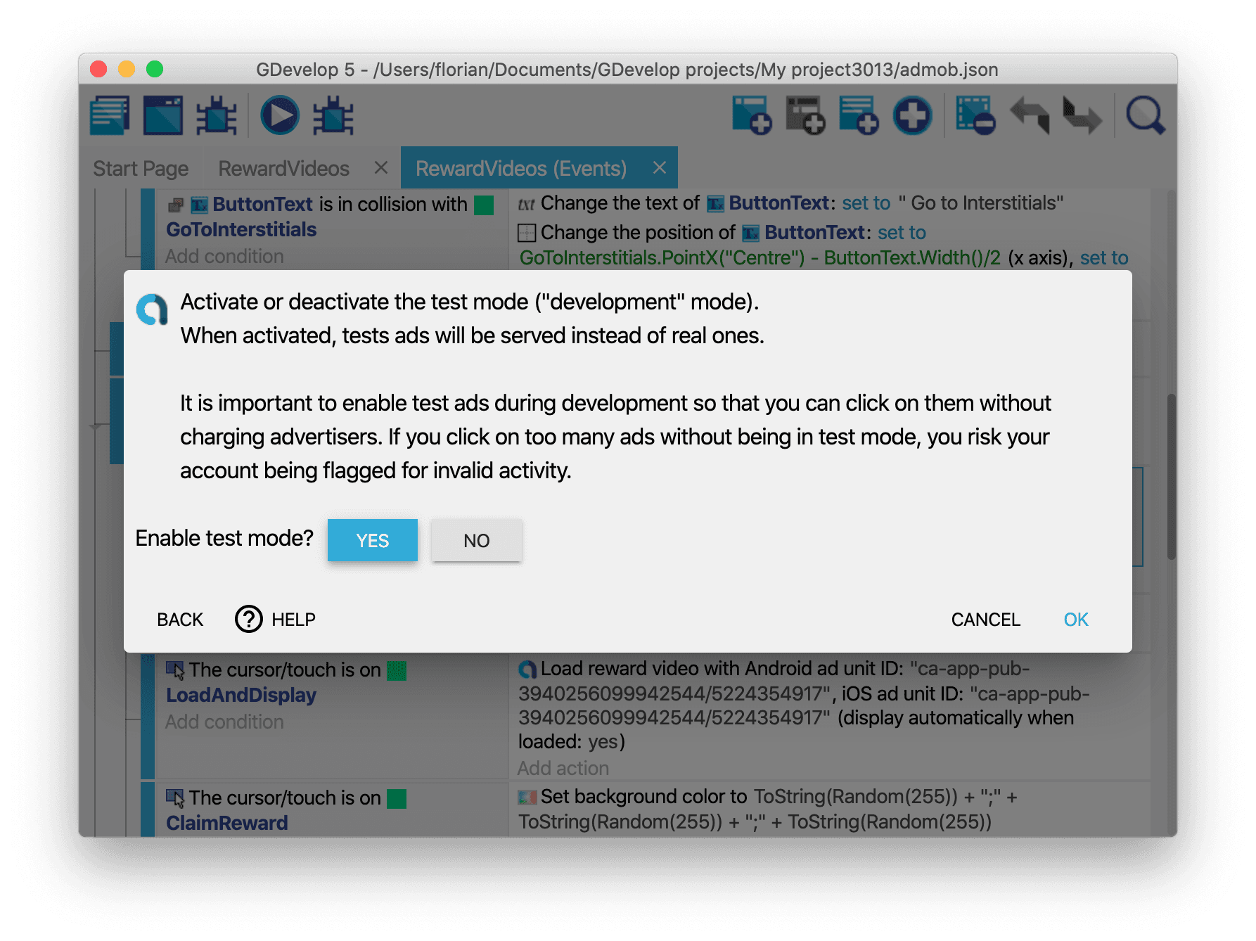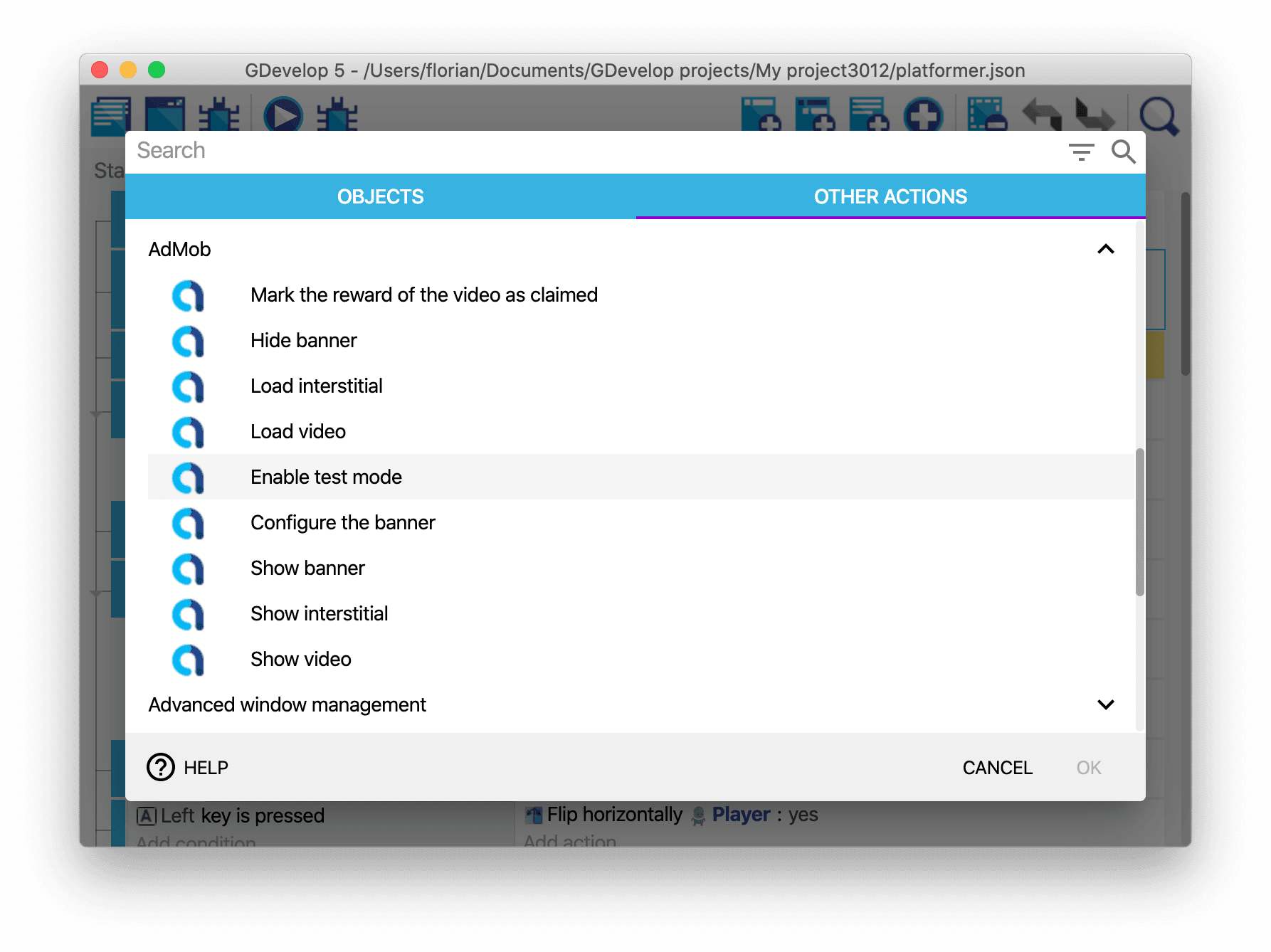 See how the ads work in a game by opening the example called AdMob. Replace the app id and the ad unit identifiers in the actions to test with your own account.
