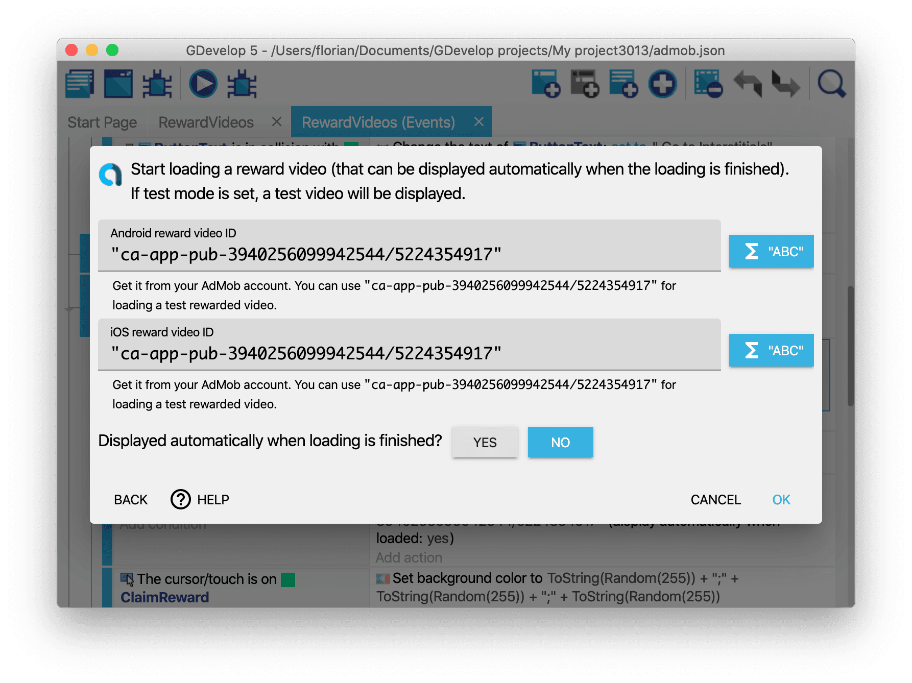 In the action, paste the ad unit id in the parameters (one for Android and one for iOS). Because parameters are string expressions, you must put the ad unit identifier between quotes.