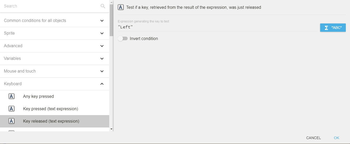To test a key press using this condition, you need to enter the key name in the form of text expression. For example, if you want to check condition for left arrow key press, you need to enter "Left" in the field.