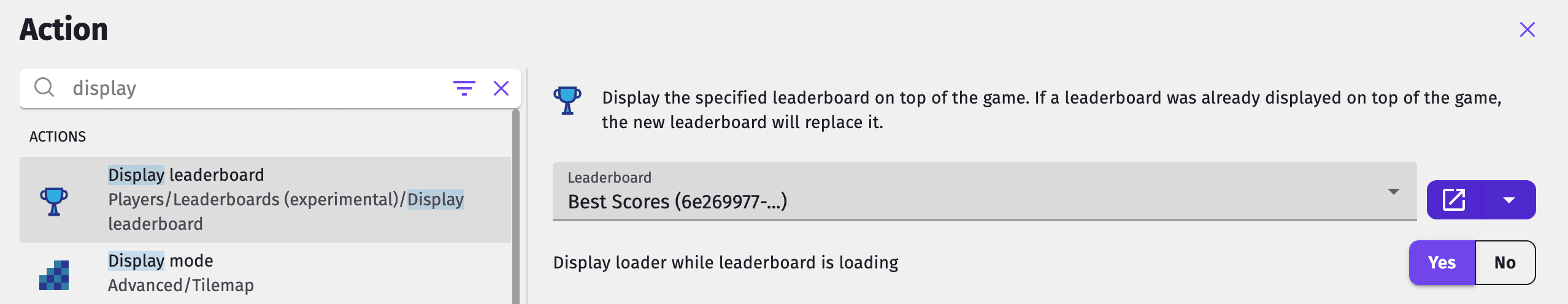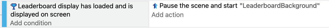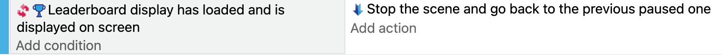 - Use the condition "Leaderboard display is loading" to trigger an action (display a text "Loading" for example)