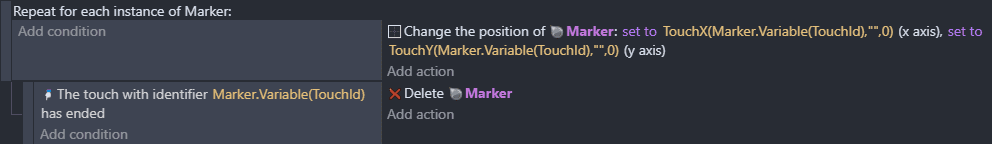 - When the touch moves, the touch identifier is needed to make sure to follow the right touch. A variable can be used to ensure this.