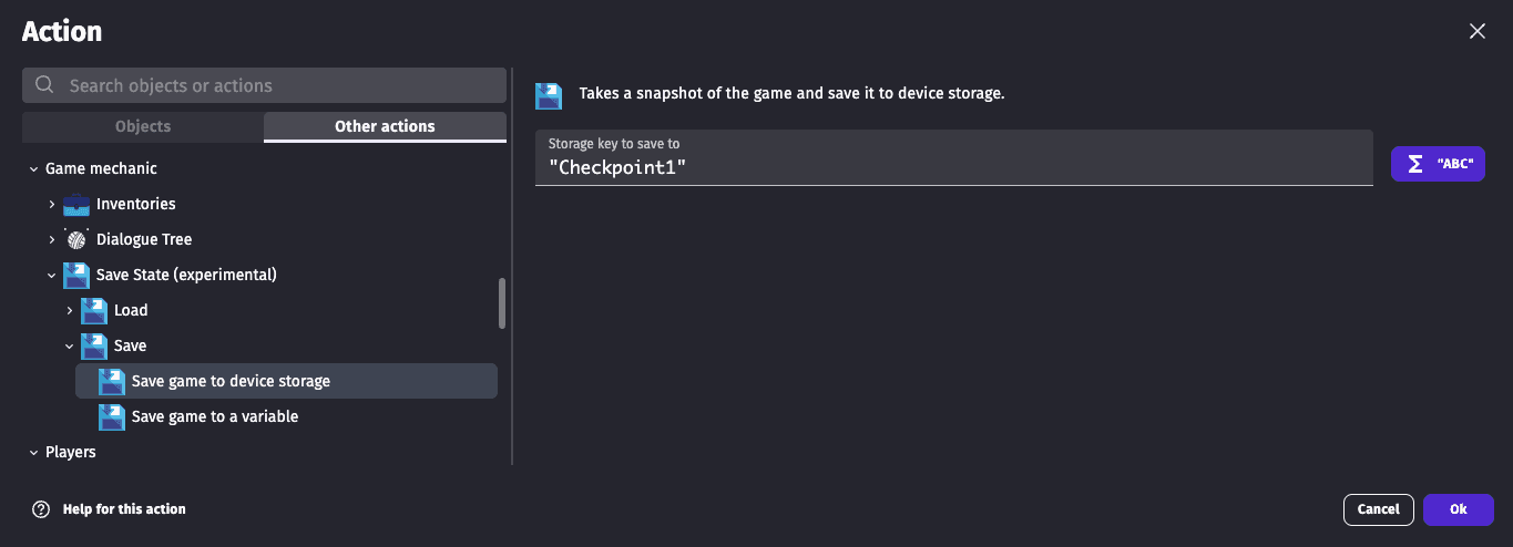 - Using a scene or global variable This is a more advanced way to save/load the game state, and can be used for example to implement checkpoints in your game. The game state is saved in a variable, that you can then store it in a file or send to a server. The downside is that the data is not persisted between game sessions, as variables are reset when the game is closed.