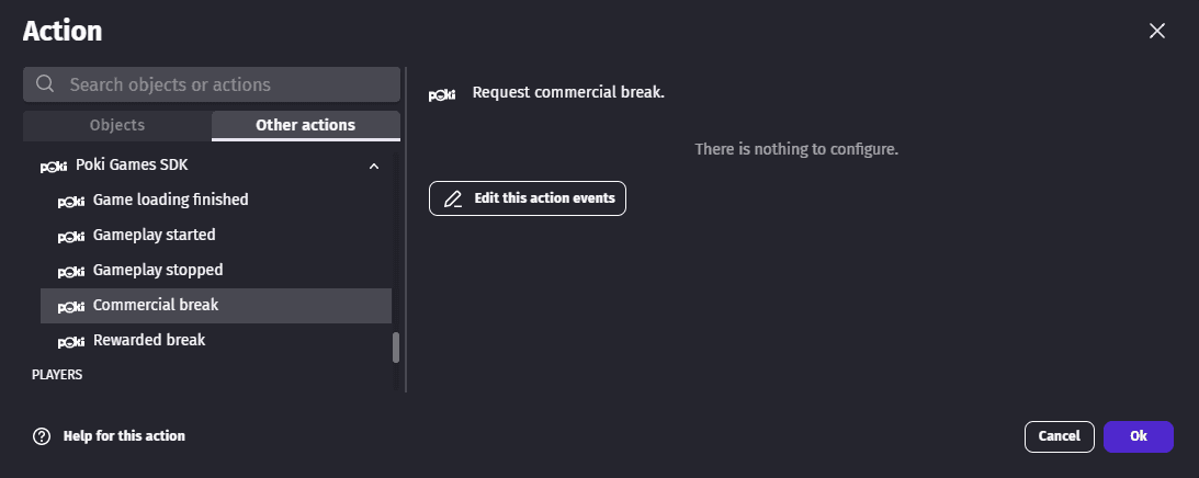 Ads can be displayed using either the Commercial break or Rewarded break actions. Please refer to Poki's ads best practices to understand when to use one or the other.