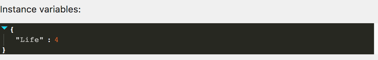 Variables will be shown in a list showing variable names and values (either a number or a text). Here is an example of an instance of an object having a "Life" variable: