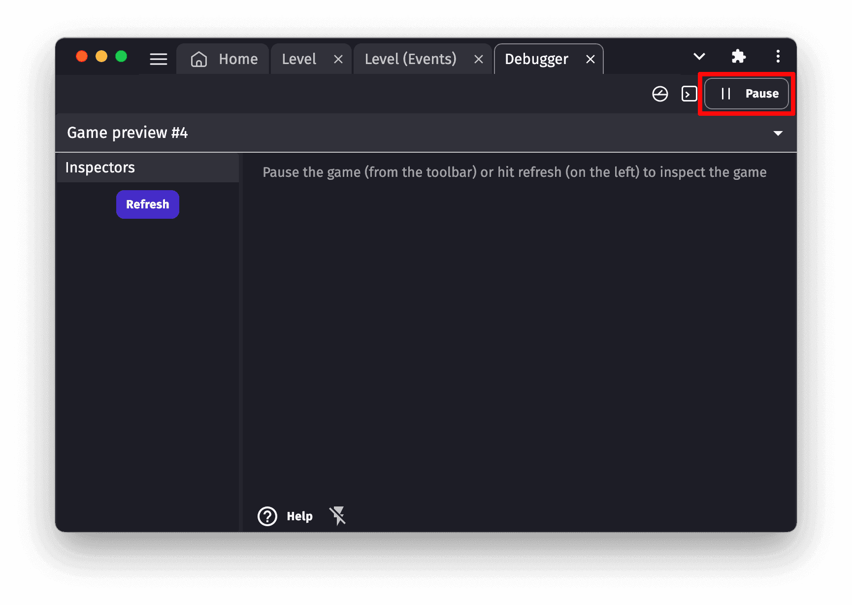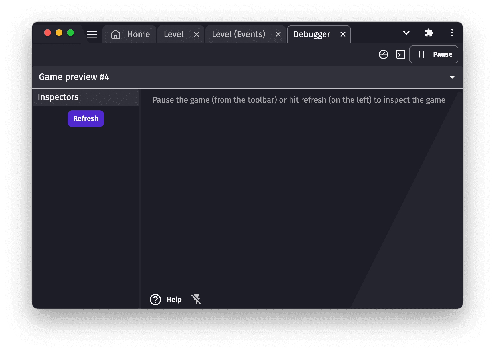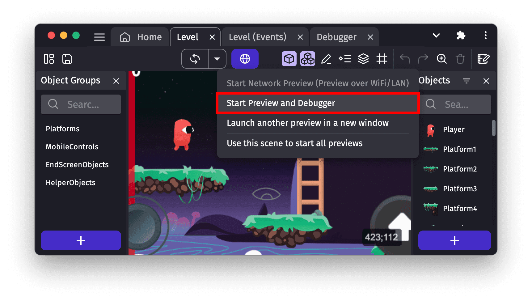 This will open a new tab called "Debugger" and will also launch a preview of your game as usual.