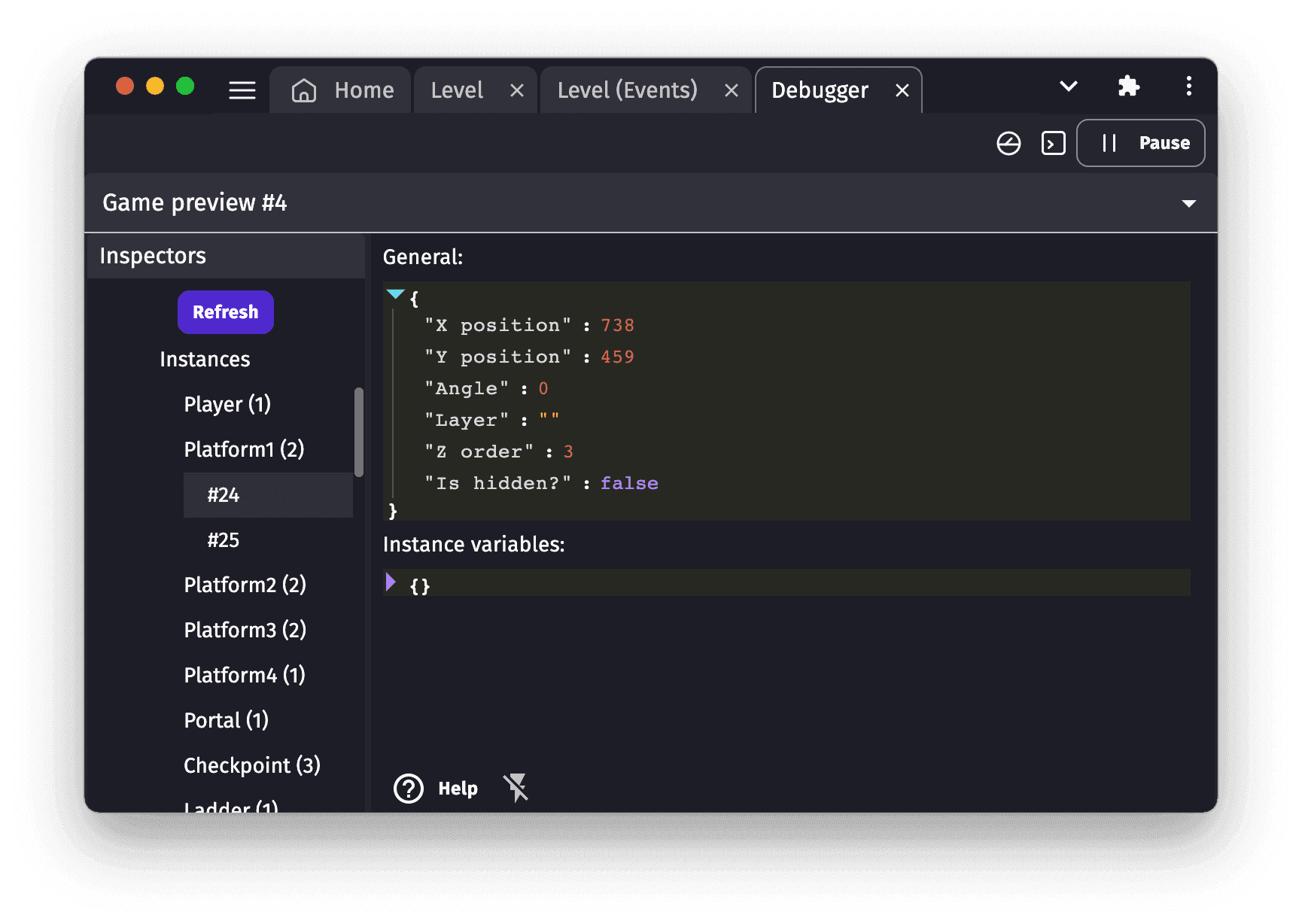 The Debugger is a tool that lets you inspect the contents of your game. Allowing you to inspect the global variables, scene variables, and variables of instances of your objects. You can pause the game at any time, and check to see why something isn't working as intended or to do quick tests in your game.