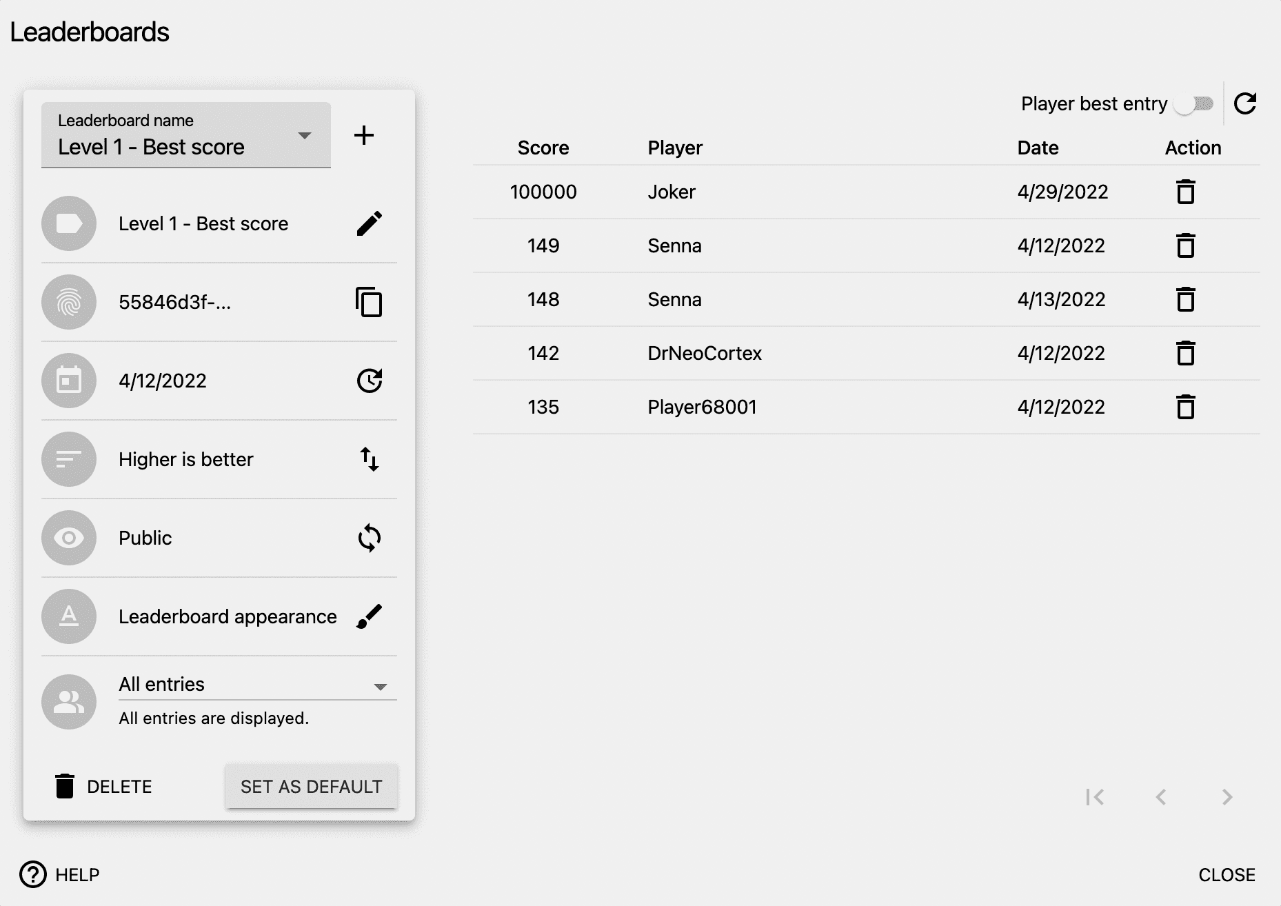 There are 2 ways of displaying your leaderboard. The first option is to display every entry submitted to your leaderboard, whereas the second one only displays the best entry for each player (identified by their player name).