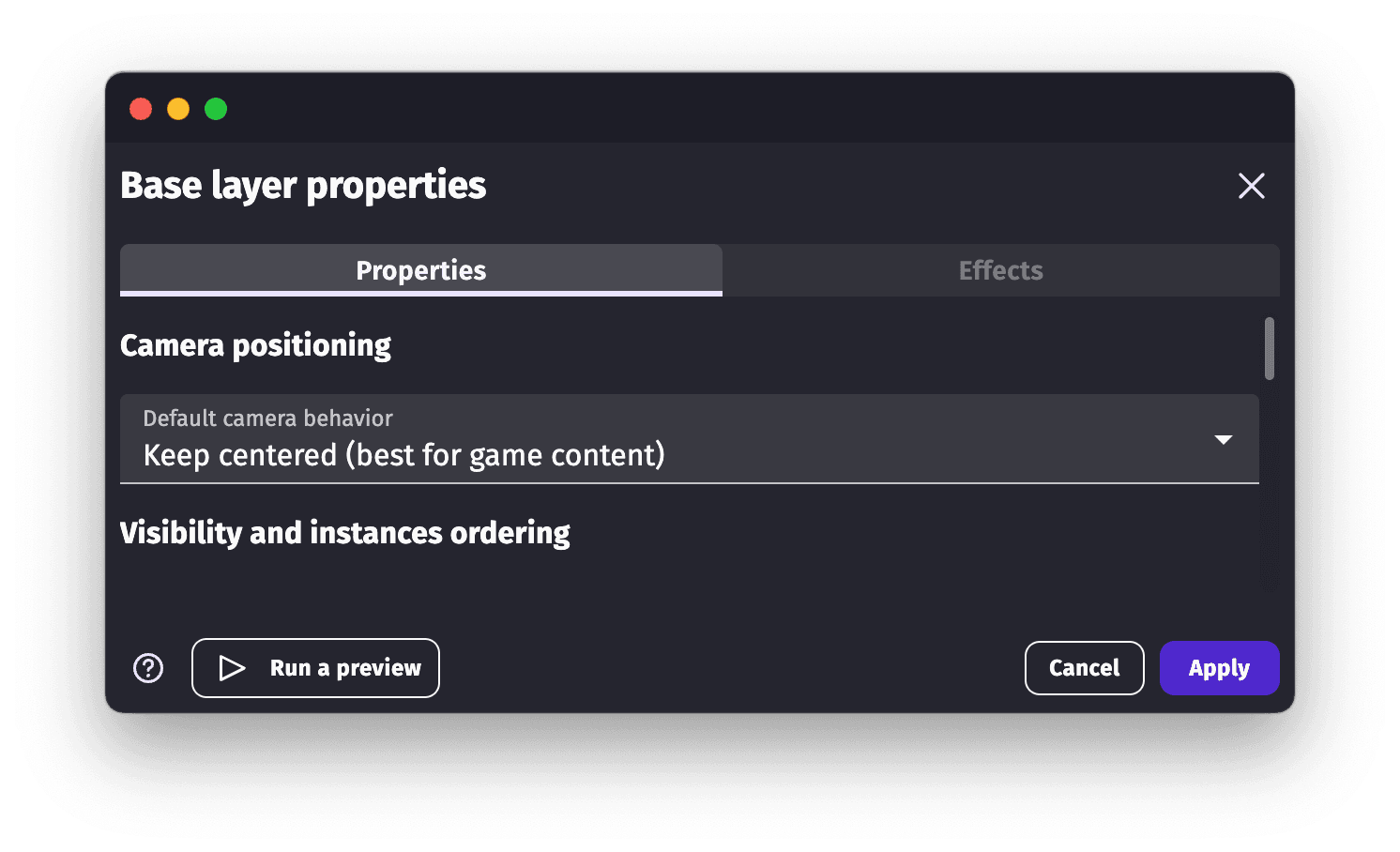 - The camera of the layer stays centered when the game window is resized. This is usually useful for game content or menus