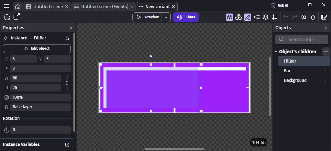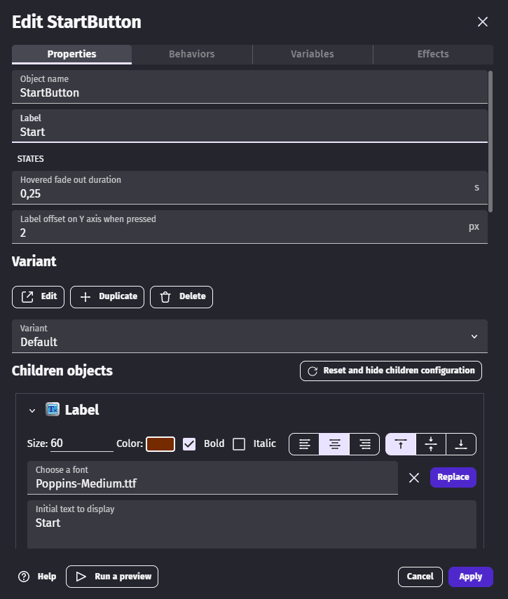 - Report your configuration on the Object's children on the left. For convenience, you may want to open your project backup in a second instance of GDevelop.