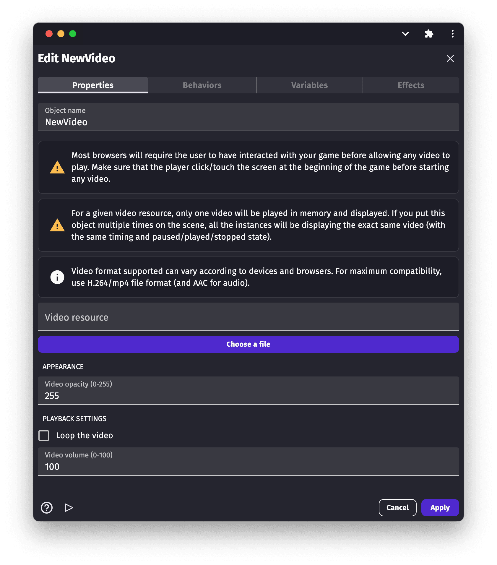 A video object displays a video on the screen. It's perfect for cut-scenes in a game. Videos can be controlled using events: timing, state (play/paused), audio volume, etc.