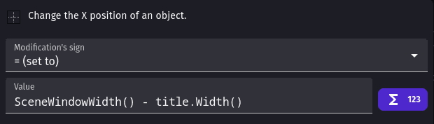 To center your text in the scene window, use the Center X position action with a value of SceneWindowWidth() / 2