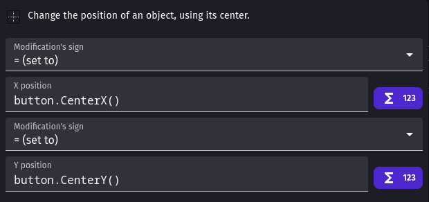 The process for aligning text to other objects is similar. Consider placing a text object on a button. Use the Center position action with X and Y values OBJECT.CenterX()