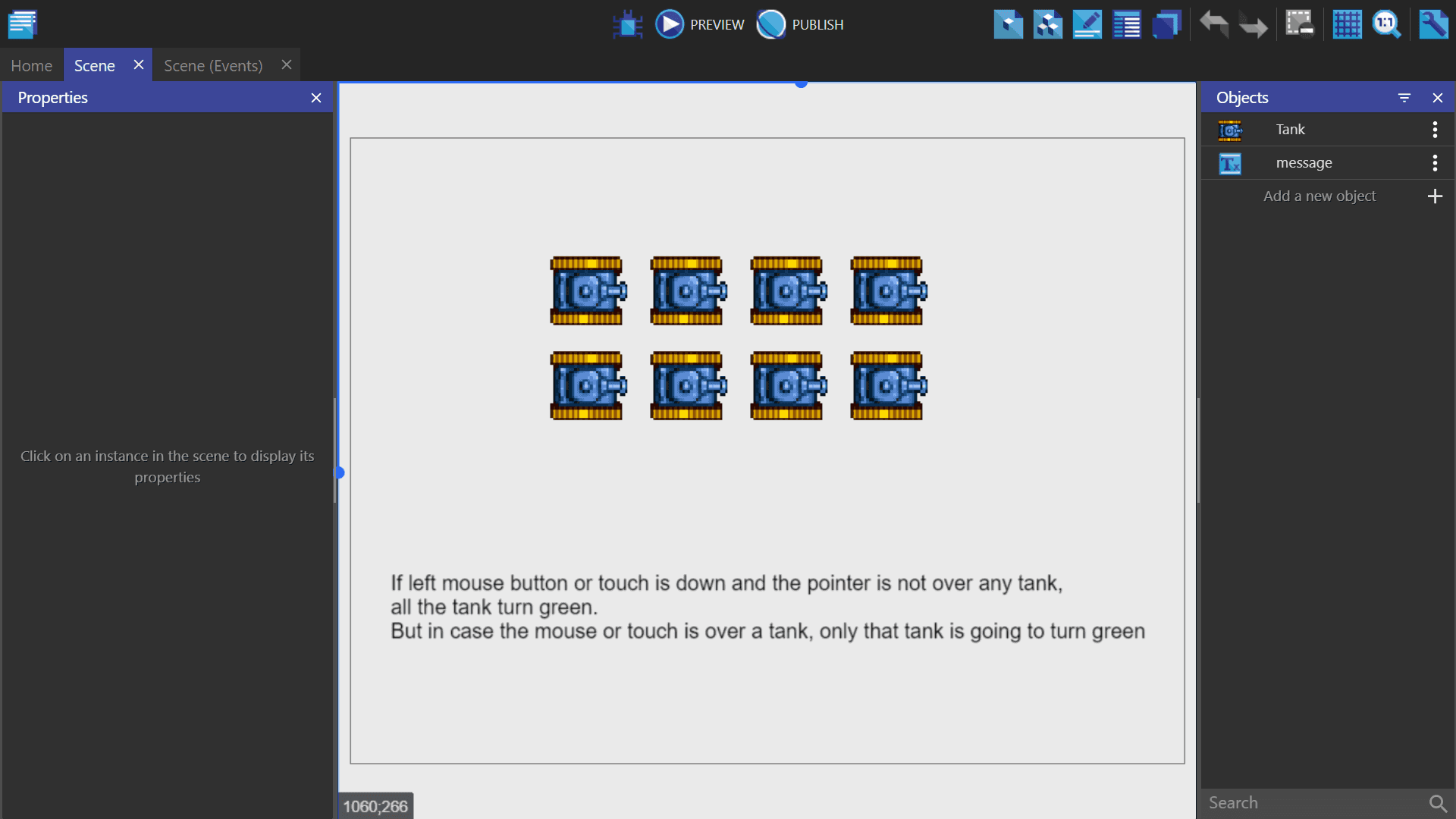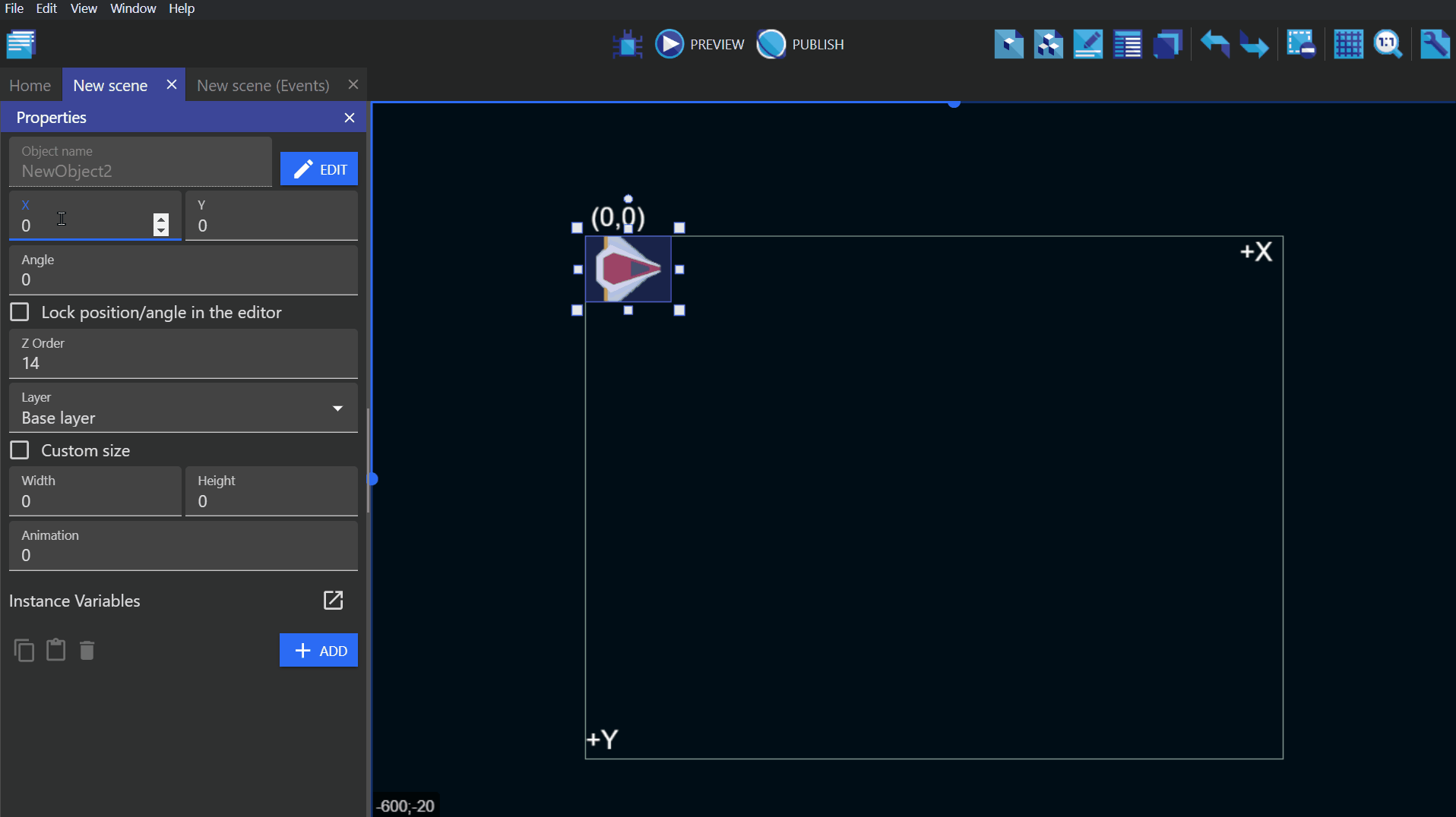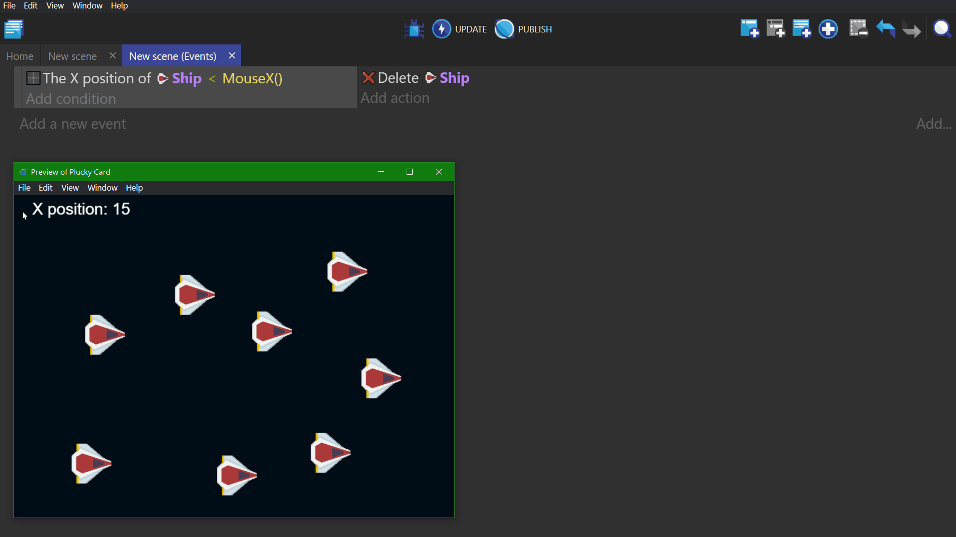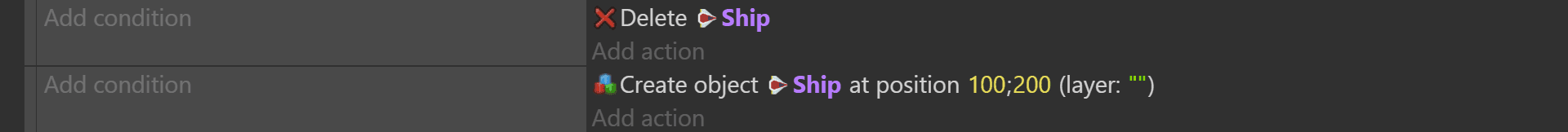 - In the bottom example, the first event deletes all the "Ship" objects from the scene/screen. It then creates one "Ship" at the coordinates X: 100, Y: 200 (100;200) on the base layer. This pair of events will display a single ship on the screen. (Behind the scenes, the ship is being deleted and recreated on every frame, which is not something you would want to do in a real game.)