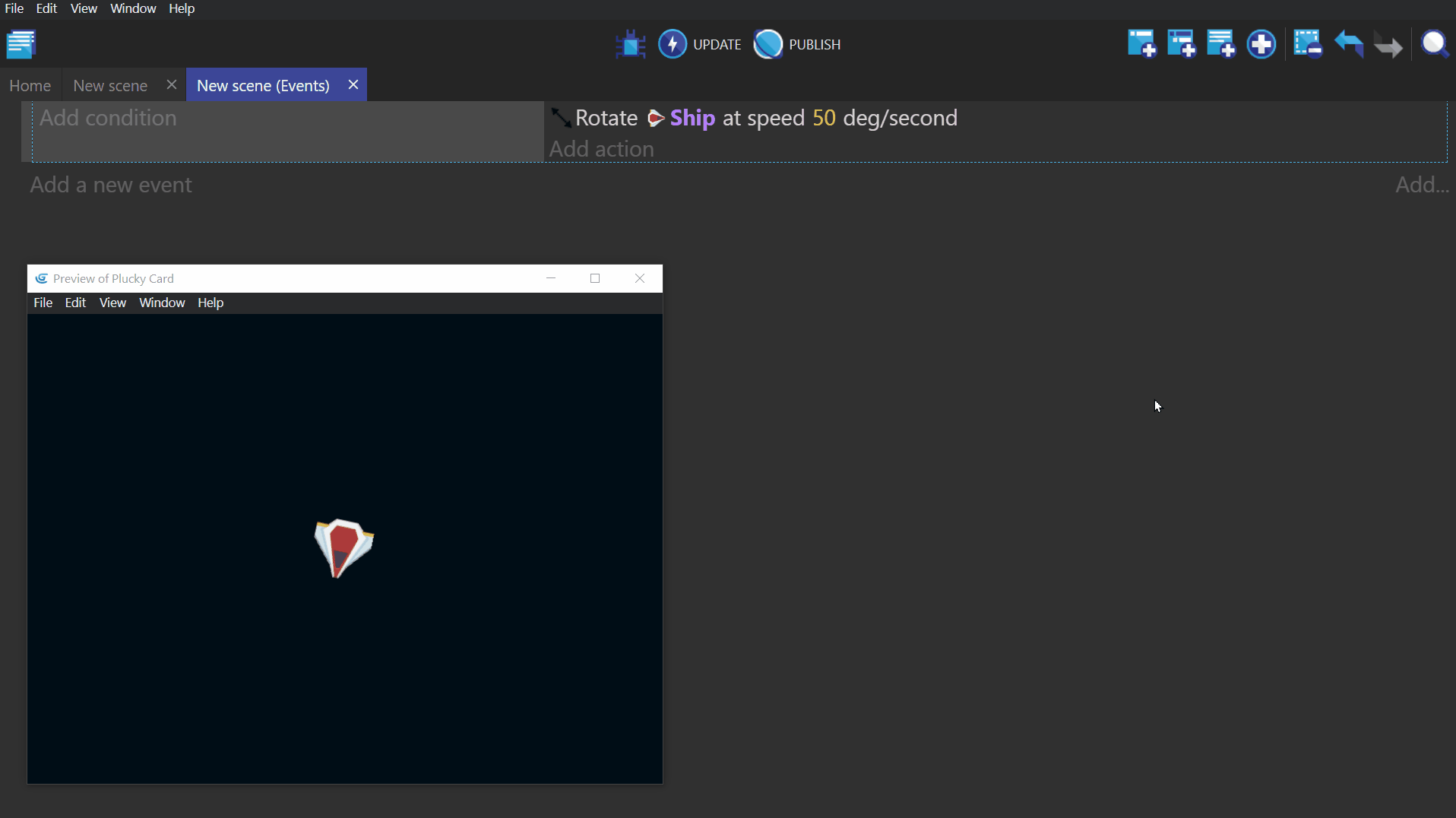 An event without any conditions will always perform the actions. In the video below, the ship object will continuously rotate at the speed set in the Rotate Ship action.