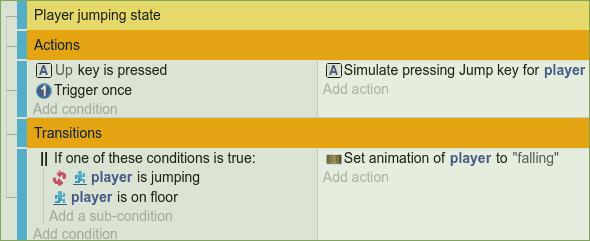 Instead of the animation, we could have created here a dedicated Scene Variable "state" to control the player state. This is more advanced but allows for better flexibility. However, the approach presented here has the benefit of bundling the logic with the corresponding animation, allowing for clarity and simplicity in the event sheet. Furthermore, you have access to the frames of the current animation/state and can trigger some logic at a certain frame inside the animation.
