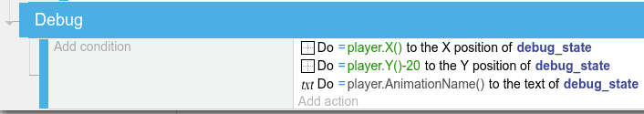 In order to know in which state the player currently is during gameplay, create a text object and call it “debug_state”. Add it to the main scene and create the actions as below (with an empty condition), in order to display the current player state right above its head. Whenever something doesn't function the way it should, we will know which state we have to investigate to find the error.