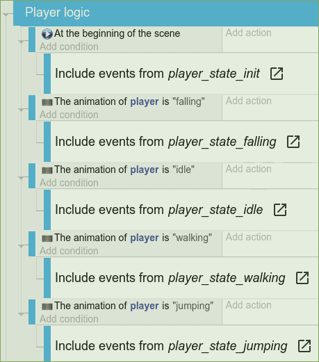 So let's get started by downloading the assets from the “” tutorial. Create a player as a “platformer object” and some platforms (“platform” behavior) to walk and jump on as described in the above-mentioned tutorial. Open the properties of the player object and create the animations “idle”, "walking","jumping" and "falling". Then create a string variable on the player object and call it “direction” with the value “right”. Switch to the event editor (“main” scene) and create these external events “playerstateinit”, “playerstatefalling”, “playerstateidle”, “playerstatewalking”, “playerstatejumping”. In the events of your main scene create a new event group from the drop-down menu on the right-hand side. Name it “Player logic”. Now add a "At the beginning of the scene" condition. Add a sub-event to the condition and link in the external event sheet “playerstateinit” via the “add”/”other” button. Do the same for all the other player states.