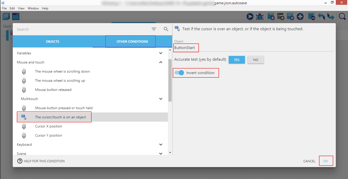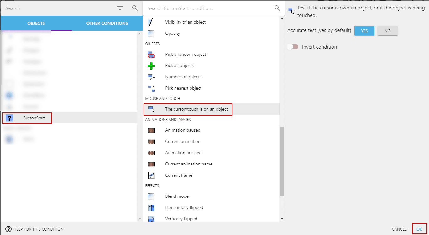 Add a new condition: "Other conditions", then "The cursor/touch is on an object", and assign this to "ButtonStart". Don't forget to select "Invert condition" to make this work as we want it.