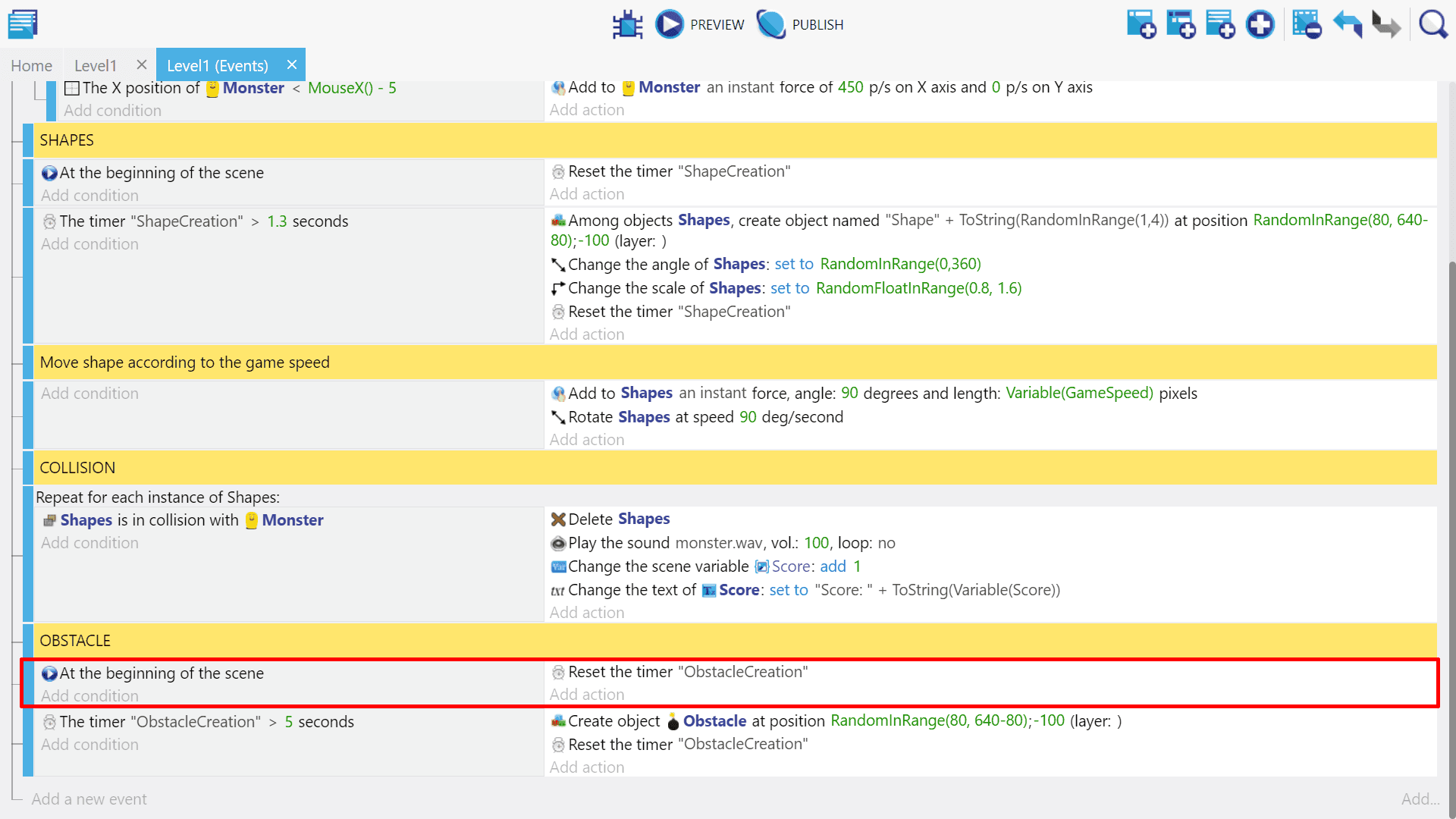 Next create a new event above the obstacle event and give it the condition “at beginning of the scene”, and copy/paste the earlier create “Start (or reset) a scene timer” action for “ObstacleCreation” to this new event. This will start the timer at the beginning of the game in so the obstacle event will trigger the first time.