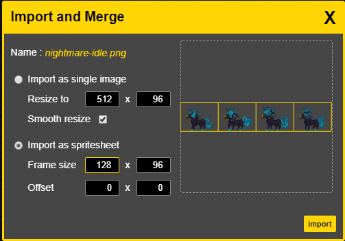 - Within the Import and Merge window, select Import as Sprite sheet.