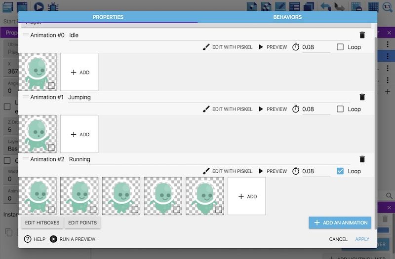 In GDevelop, you can add animations to an object and trigger those animations when something happens (such as when a player jumps).