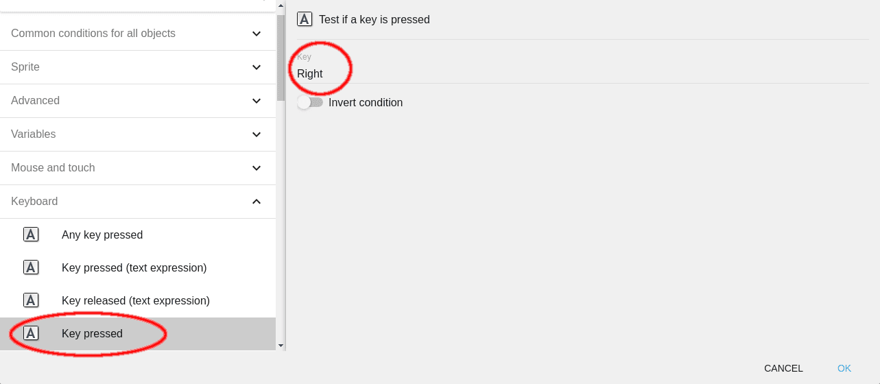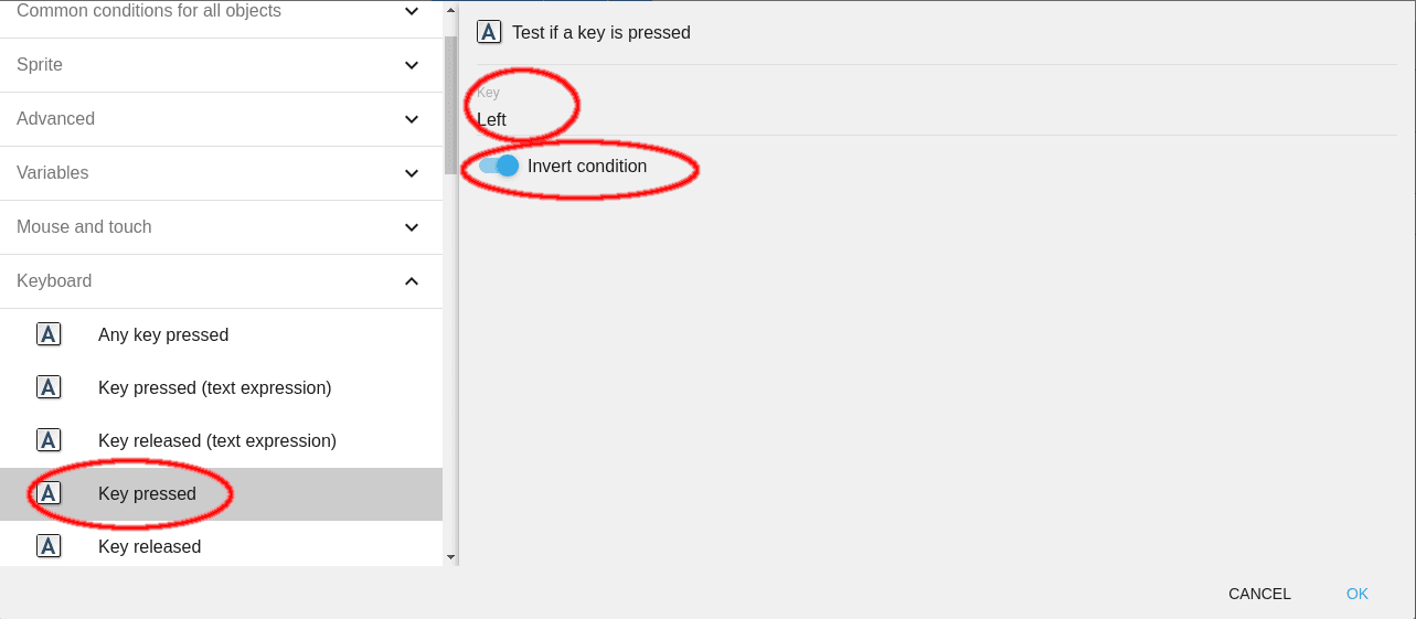 To achieve this, we add a new event and try to add the above 2 conditions, i.e. right key press inverted and left key press inverted. We add a condition Left key is pressed and turn on the switch below that says Invert conditions.