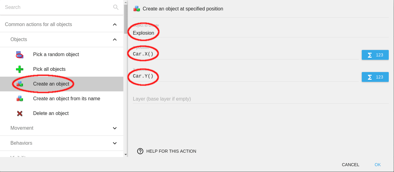 In case of this condition being true, we need to create an object Explosion. You can use the action Create an object and fill Explosion in the Object to create field.