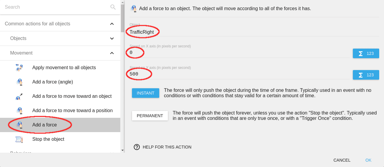 To move the cars we will now add an event with no conditions. We will now add a downward acting force to TrafficLeft and TrafficRight.