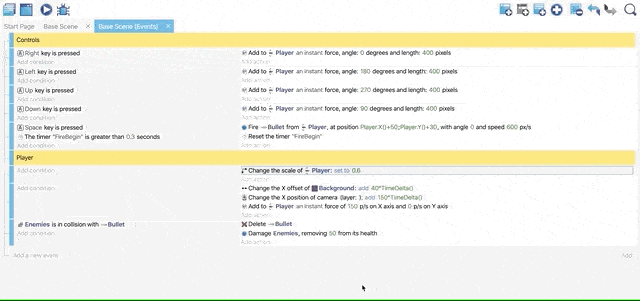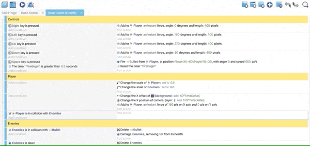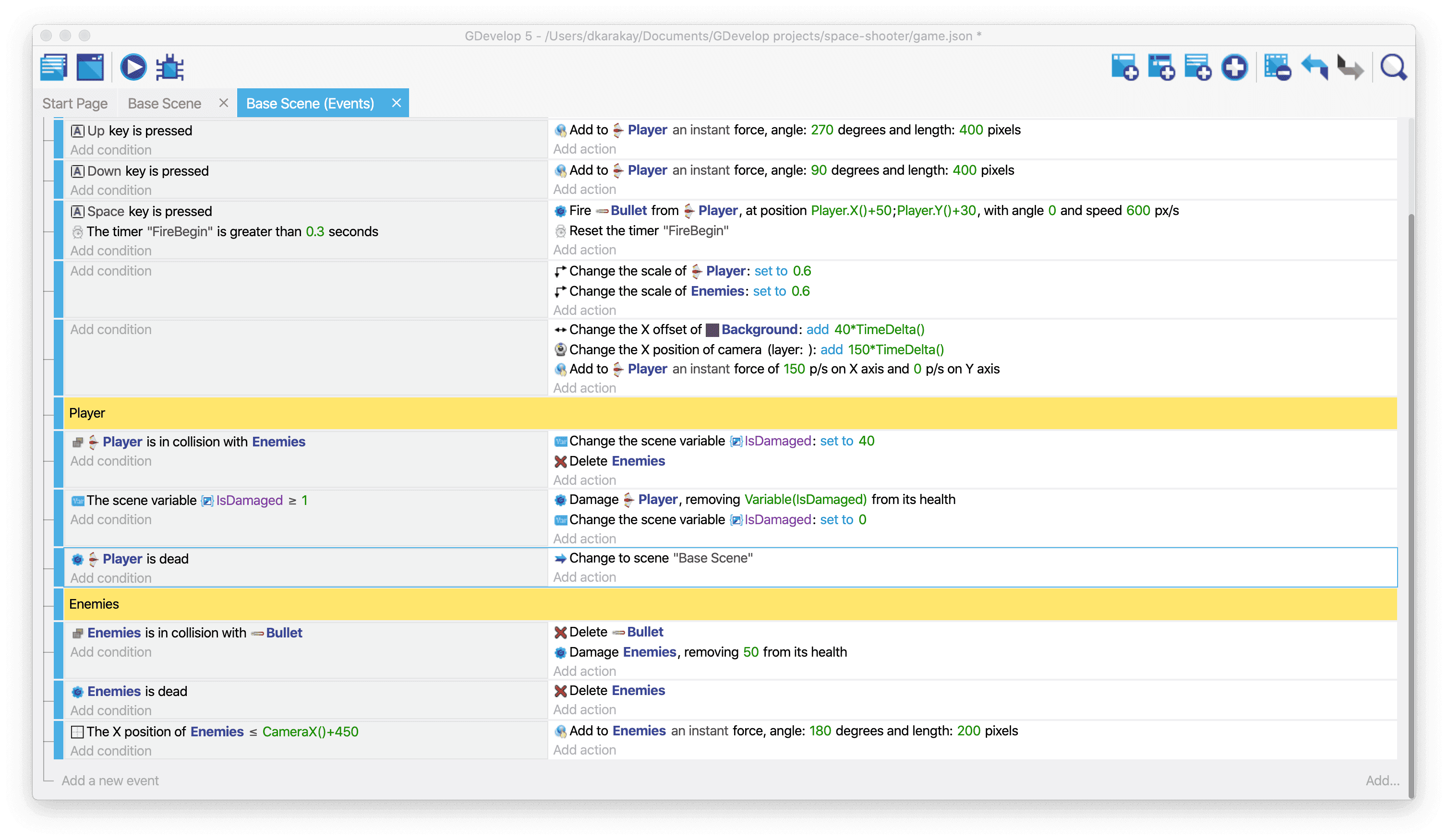 Our game is over when the player is dead. Add a new condition to check the player is dead or not. Then, add an action to restart the game. Type "scene" on the search bar and select Change the scene. Just select the "Base Scene" or your scene's name.