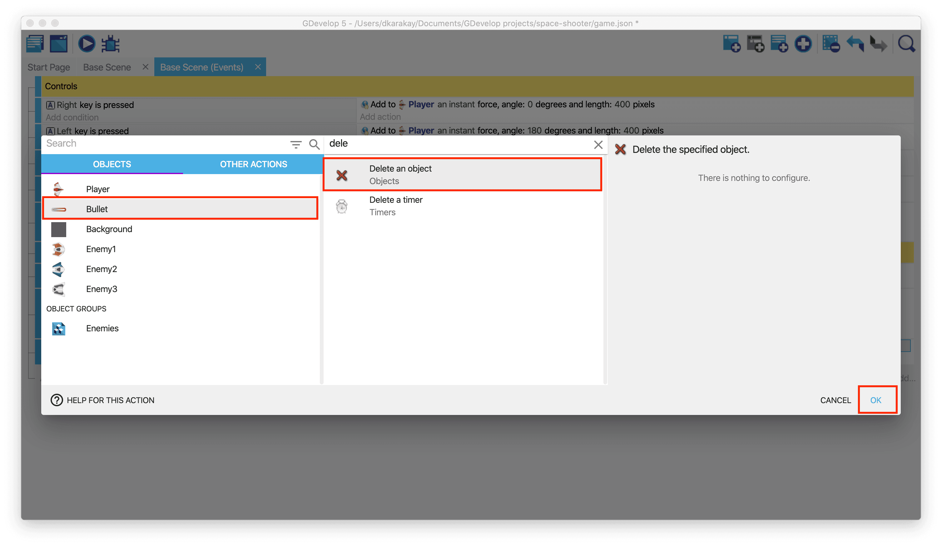 If the enemy is dead, we should delete the scene's object. We will add a new action to delete the object, just like in the previous steps.