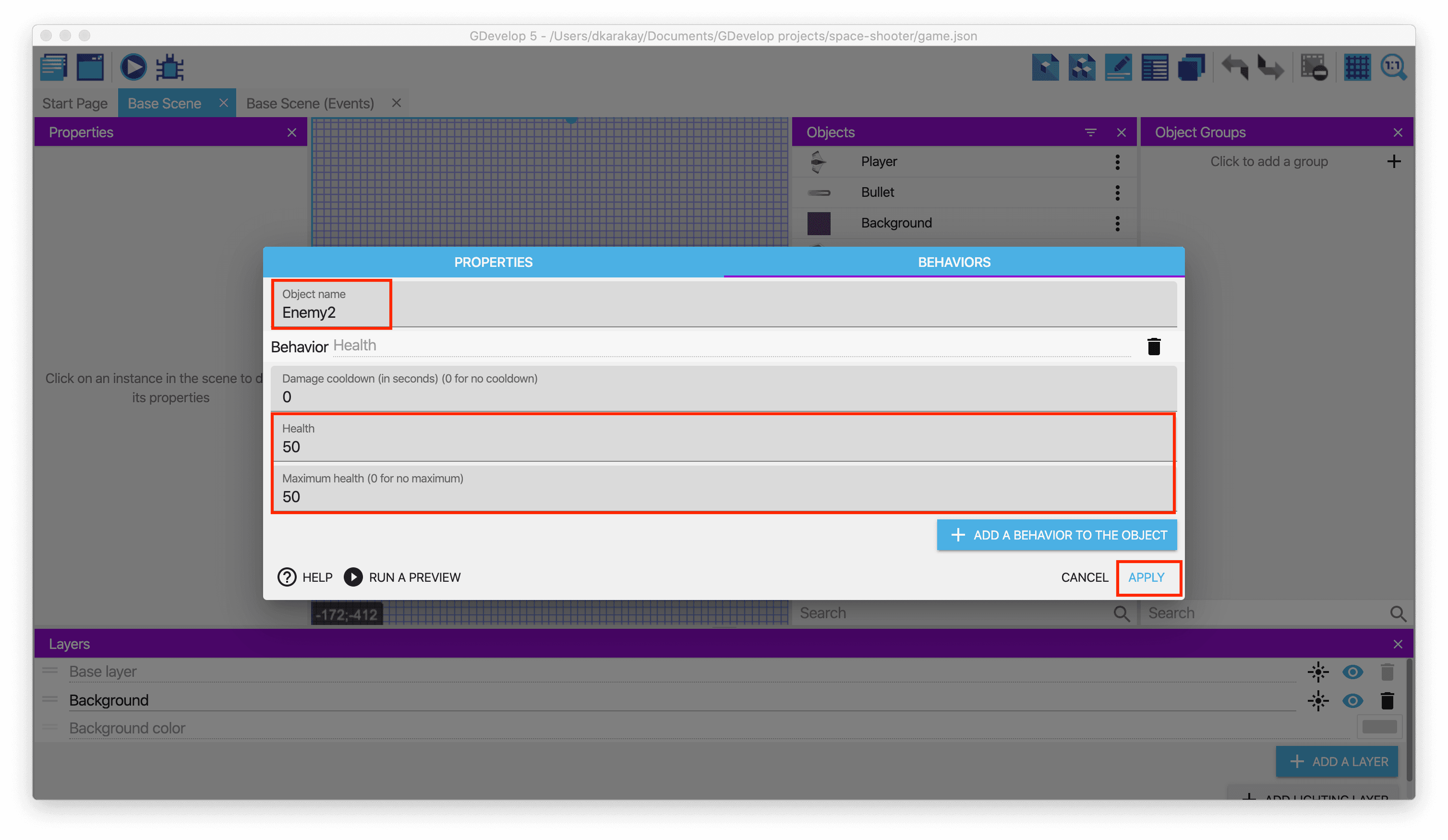 Then, open the behavior page of Enemy1 and leave it as is: Health: 100, Maximum health: 100